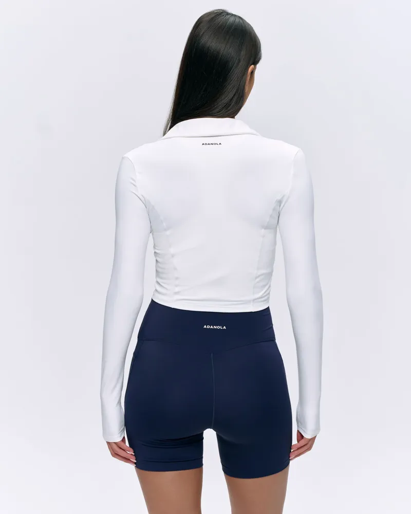 The Adanola Brushed Long Sleeve Collared Top - White is perfect for any occasion, whether you’re heading to the gym or meeting friends for brunch. Pair it effortlessly with ultimate shorts or a flirty skirt for a complete look that transitions seamlessly from workout to weekend.