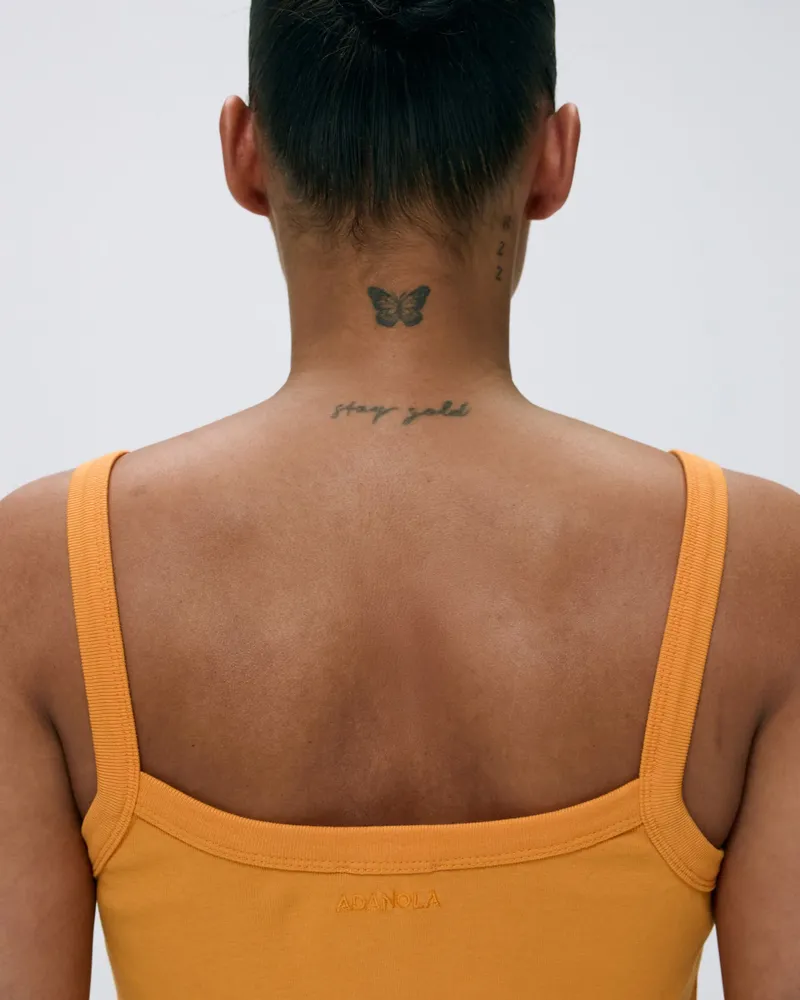 The Adanola Rib Wide Binding Baby Tank in Mango Orange is not just a top; it's a versatile staple that can elevate your everyday style. Pair it effortlessly with your favorite sweats for a chic errand look or dress it up with a skirt for a casual outing. The organic cotton fabric ensures maximum comfort, making it ideal for all-day wear.