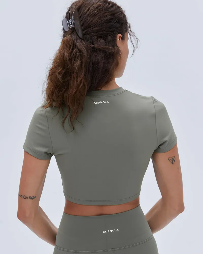Discover the perfect blend of style and functionality with the Adanola Short Sleeve Crop Top - Olive Green. Designed for active days, this lightweight crop top offers support and breathability, allowing you to move with confidence.