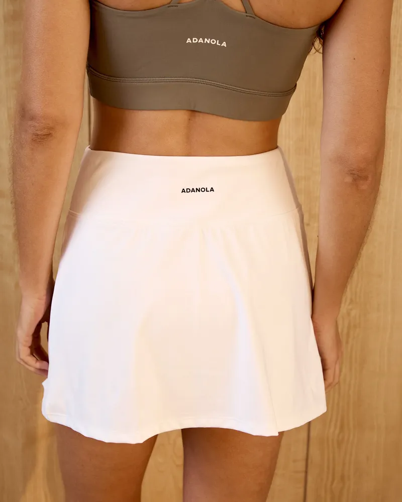 The Adanola Ultimate A-Line Mini Skirt - White is thoughtfully crafted to be both stylish and functional. Its relaxed fit throughout allows for easy movement, making it ideal for any activity. The high-waist design flatters your figure, while the screen-printed logo at the back adds a subtle touch of brand quality.