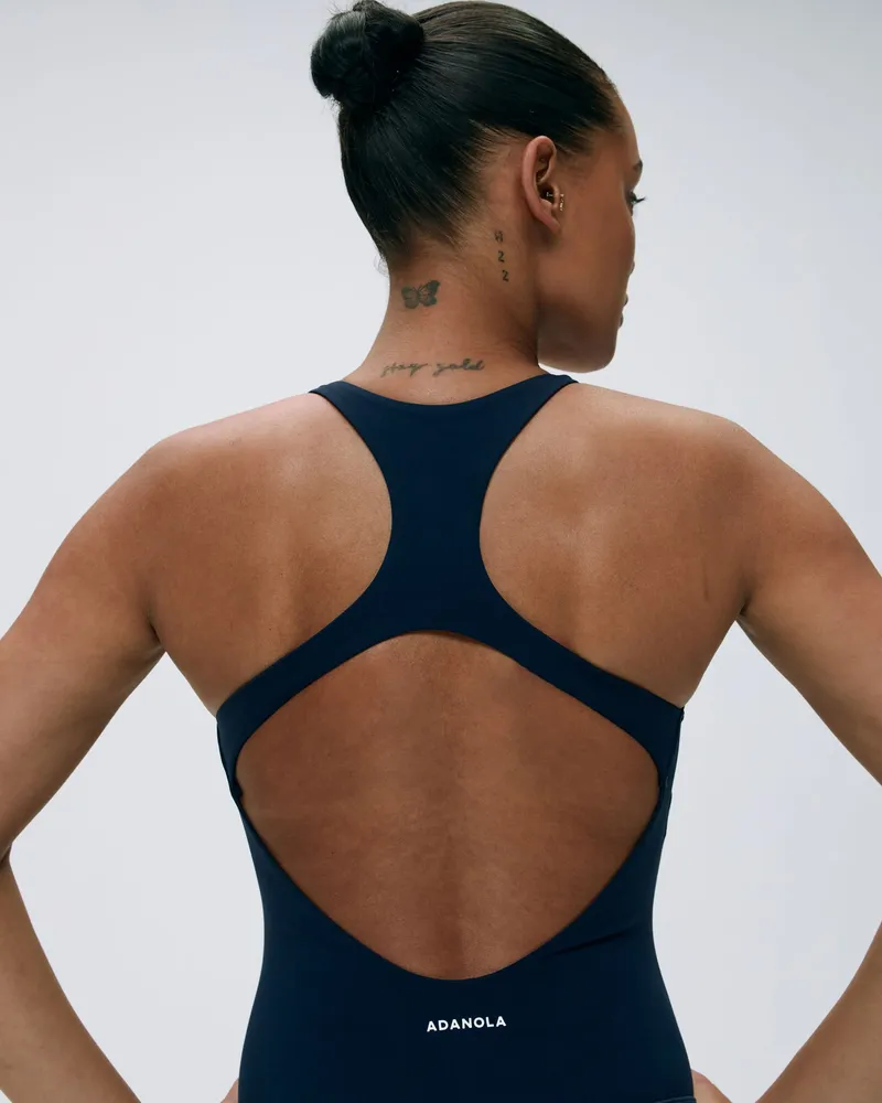 Upgrade your workout wardrobe today with the Adanola Ultimate Racer Cut Out Romper - Navy Blue. Experience the perfect blend of style, comfort, and performance—shop now!