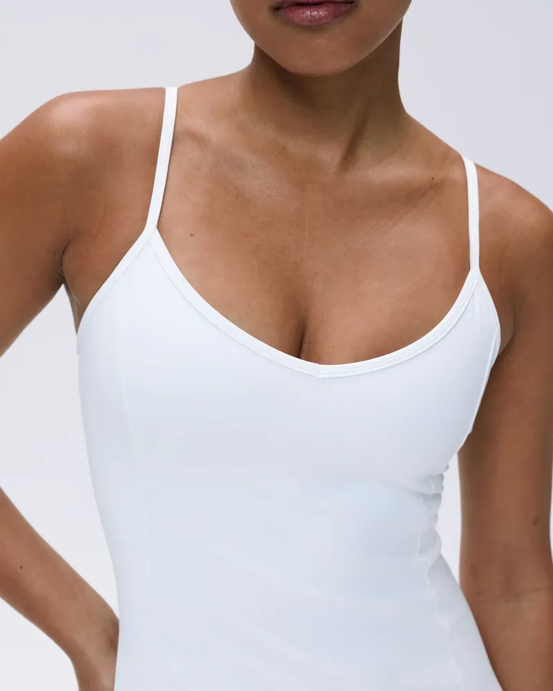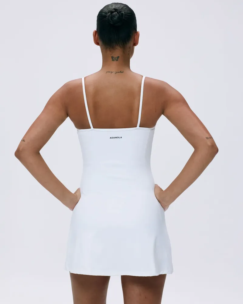 The Adanola Ultimate Strappy Tennis Dress - White features a chic strappy design and a small front split, complemented by built-in shorts for added coverage. With its side split skirt and eye-catching logo on the back, this dress is perfect for showing off your style while you serve. The compressive fit not only smooths and sculpts but also ensures you feel confident and secure during every match.