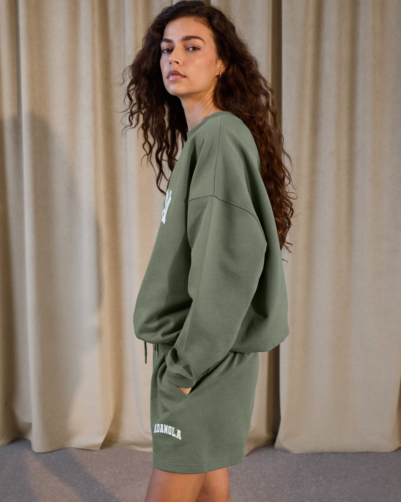 Elevate your athleisure wardrobe with the Adanola Varsity Oversized Sweatshirt in Eden Green and Marshmallow White. Crafted from premium organic cotton loop-back fabric, this sweatshirt is your go-to for comfort and style during the transitioning seasons.