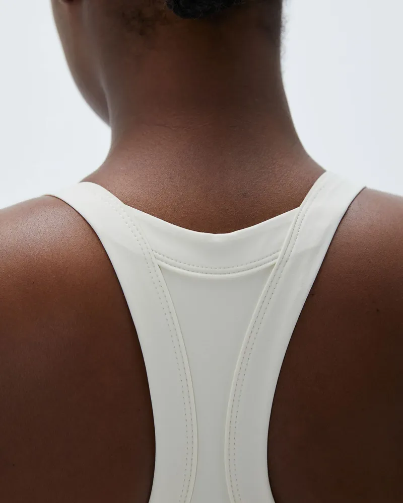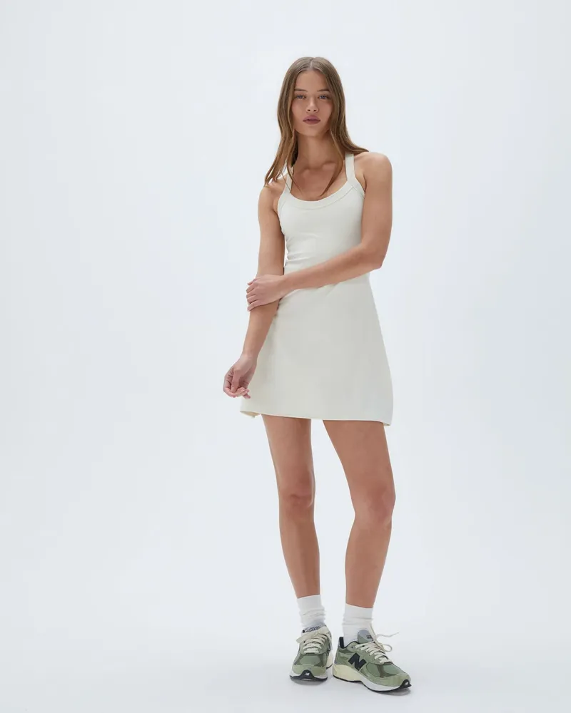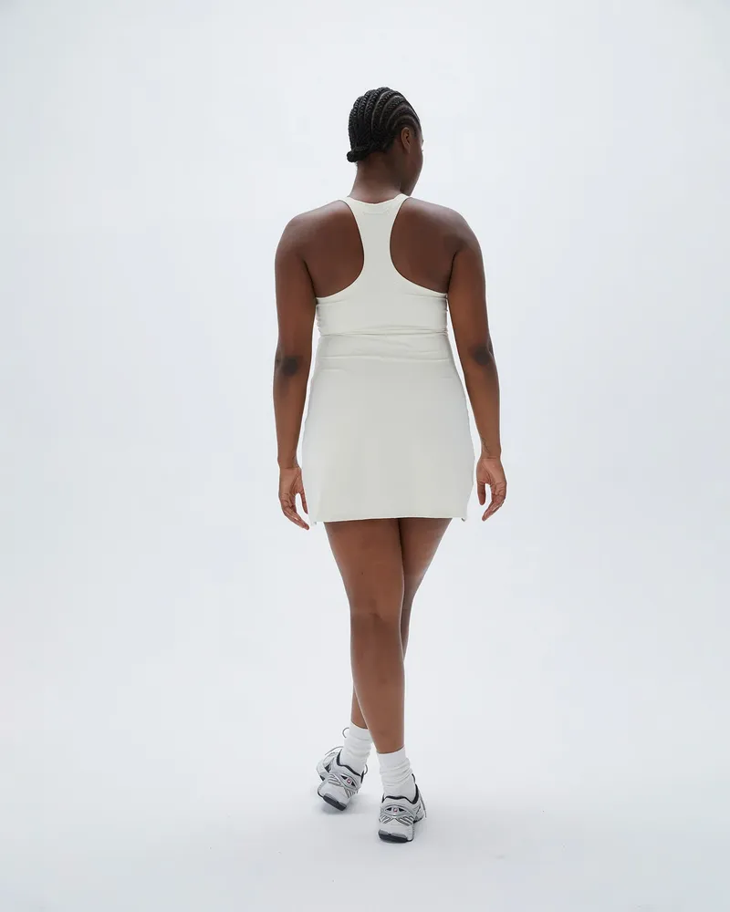 Das Adanola Wide Binding Racer Dress - Marshmallow White Kombiniert Funktionalität Mit Mode. Sein Racerback-Design Und Die Breiten Binding-Träger Bieten Sowohl Halt Als Auch Style, Während Der Seitenschlitz Dem Rock Einen Hauch Von Flair Verleiht. Kombiniere Es Mit Einer Adanola-Tragetasche Für Einen Kompletten, Trendigen Look, Der Nahtlos Vom Fitnessstudio Zum Brunch übergeht.