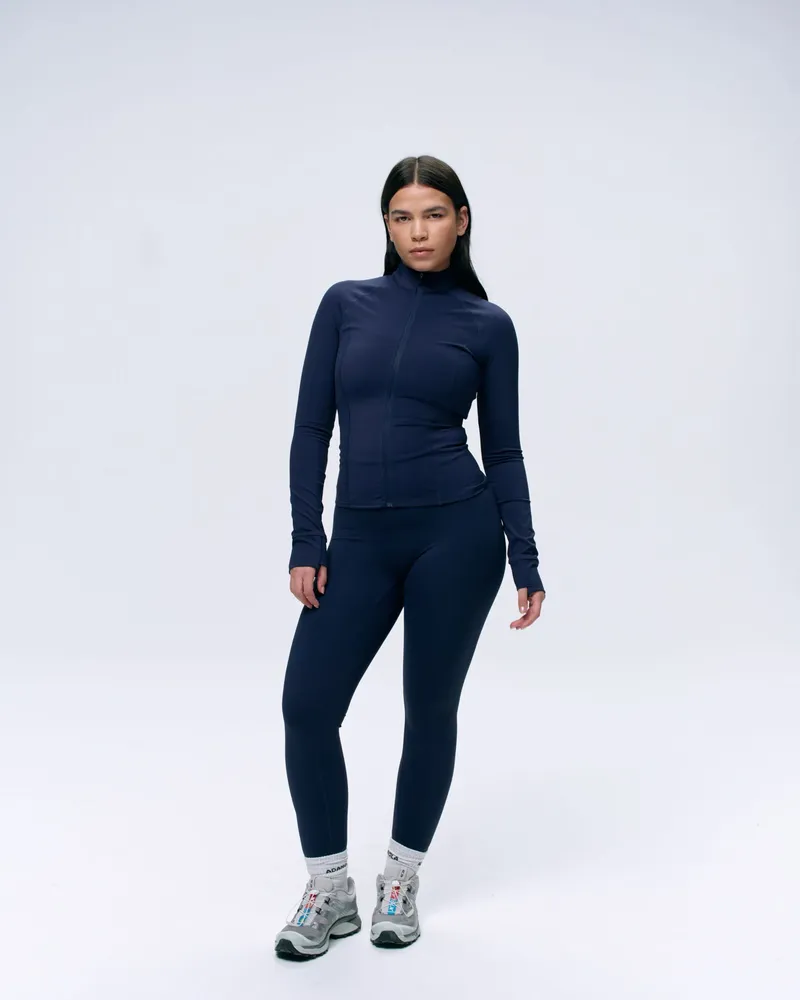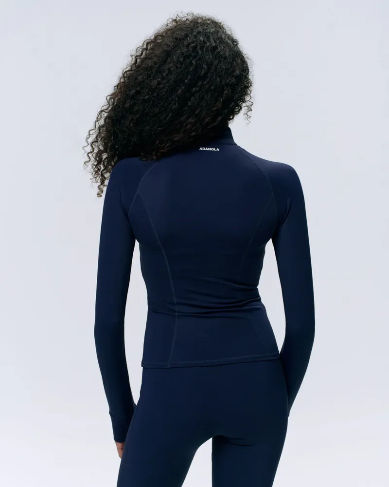 az adanola Ultimate Hosszú Ujjú Cipzáras Felső - Sötétkék Prémium Minőségű, 70% újrahasznosított Poliamid és 30% Elasztán Keverékéből Készült, Amely Puha érzetet és Kiváló Tartósságot Biztosít. A Cipzáras Nyílás Egy Csipetnyi Funkcionalitást Ad, Megkönnyítve A Viselését Edzőtermi Edzések Vagy Stílusos üldögélés Közben. Párosítsa Könnyedén Ultimate Leggingsünkkel A Teljes Edzőruházathoz, Vagy Viselje Ejtőernyős Nadrággal A Laza Napokra.