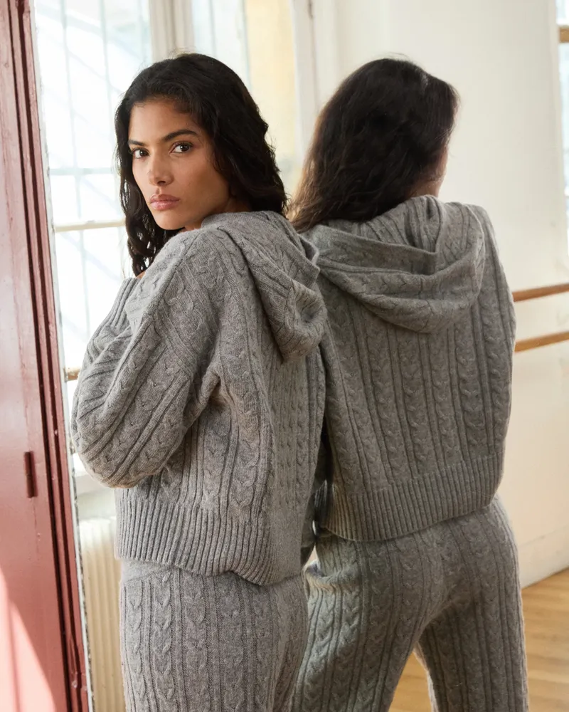 adanola Cable Knit Zip Hoodie - Ciemnoszary Melanż